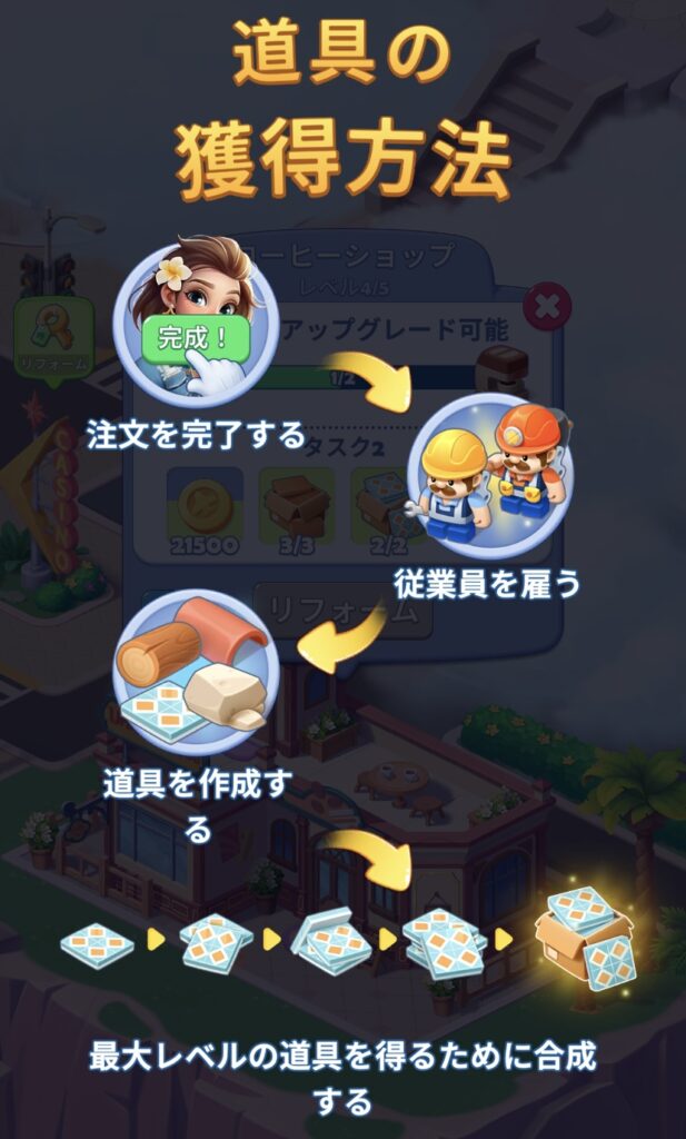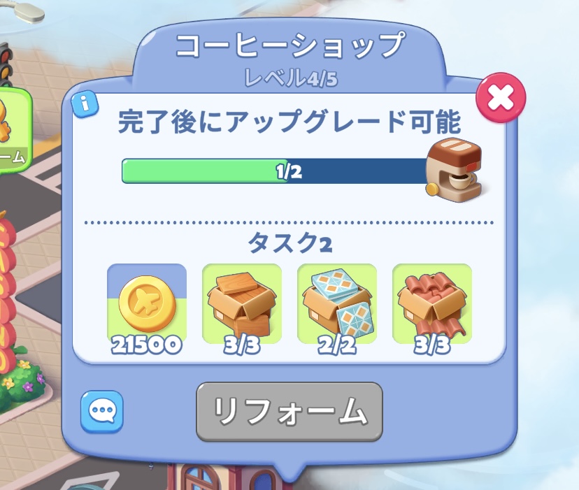 他のマージゲームと違うのは、経験値アイテムによる経験値の獲得ではなく、注文に応えてもらえるコインなどで建物を建設・リフォームするとレベルが上がっていく使用のため、どれだけコインや必要なものを揃えられるかが攻略のカギになります。