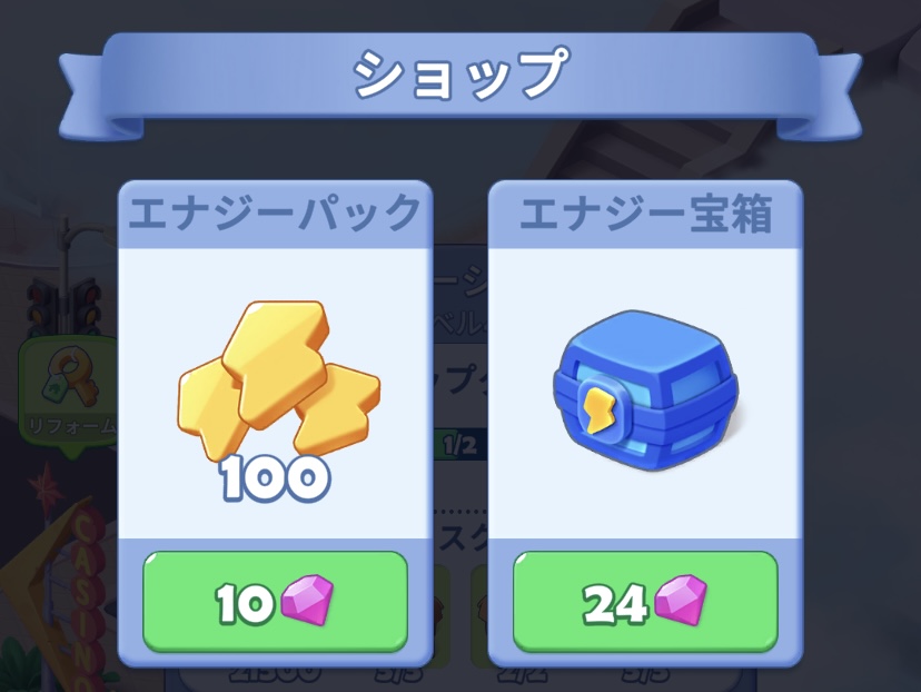 エネルギー回復方法はショップでエネルギー購入とエネルギーアイテムによる回復です。