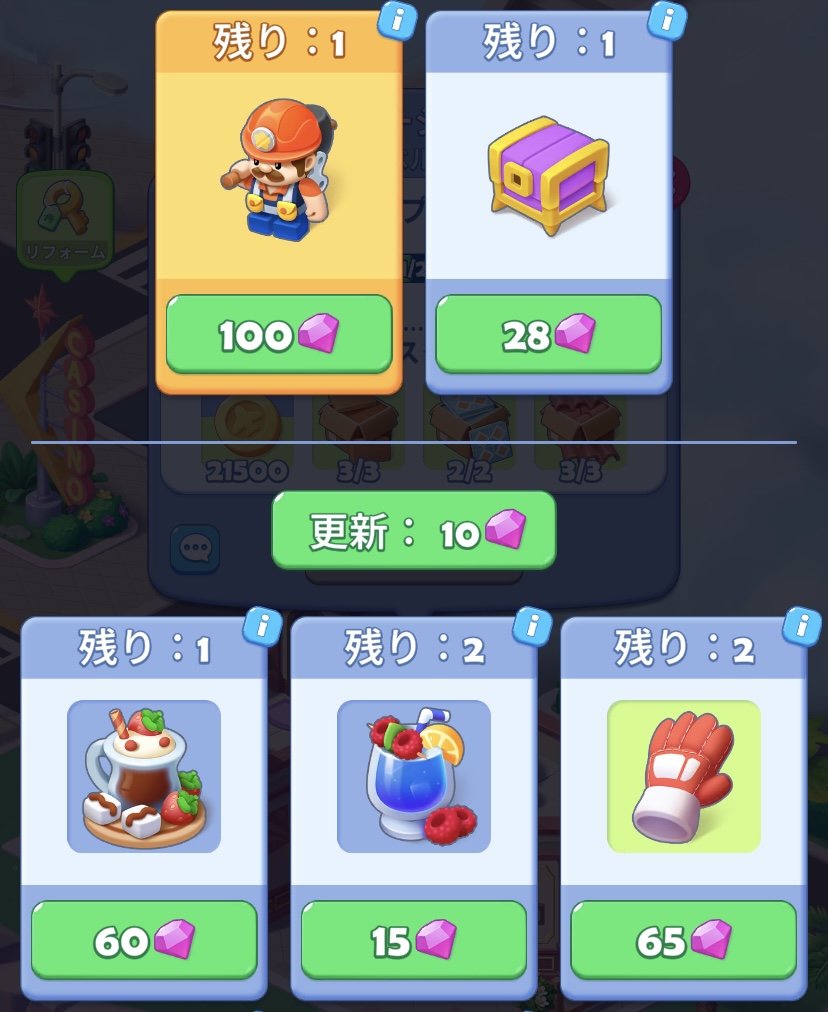 日替わりでいろいろなアイテムが並びますが、作業員や虹色ダイヤ(好きなアイテムとマージさせることができるアイテム)が並ぶこともあります。