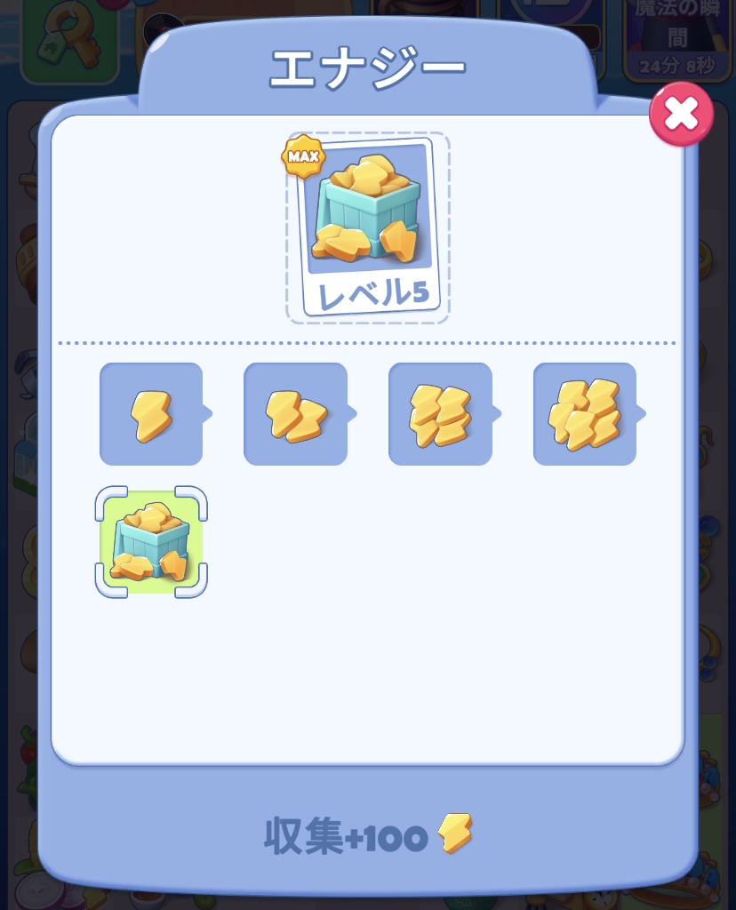 エネルギーアイテムはアイテムレベルが小さい内は少ない回復量になりますが、最大レベルにすると100エネルギーが獲得できるようになるため必ず最大レベルまでマージしましょう。